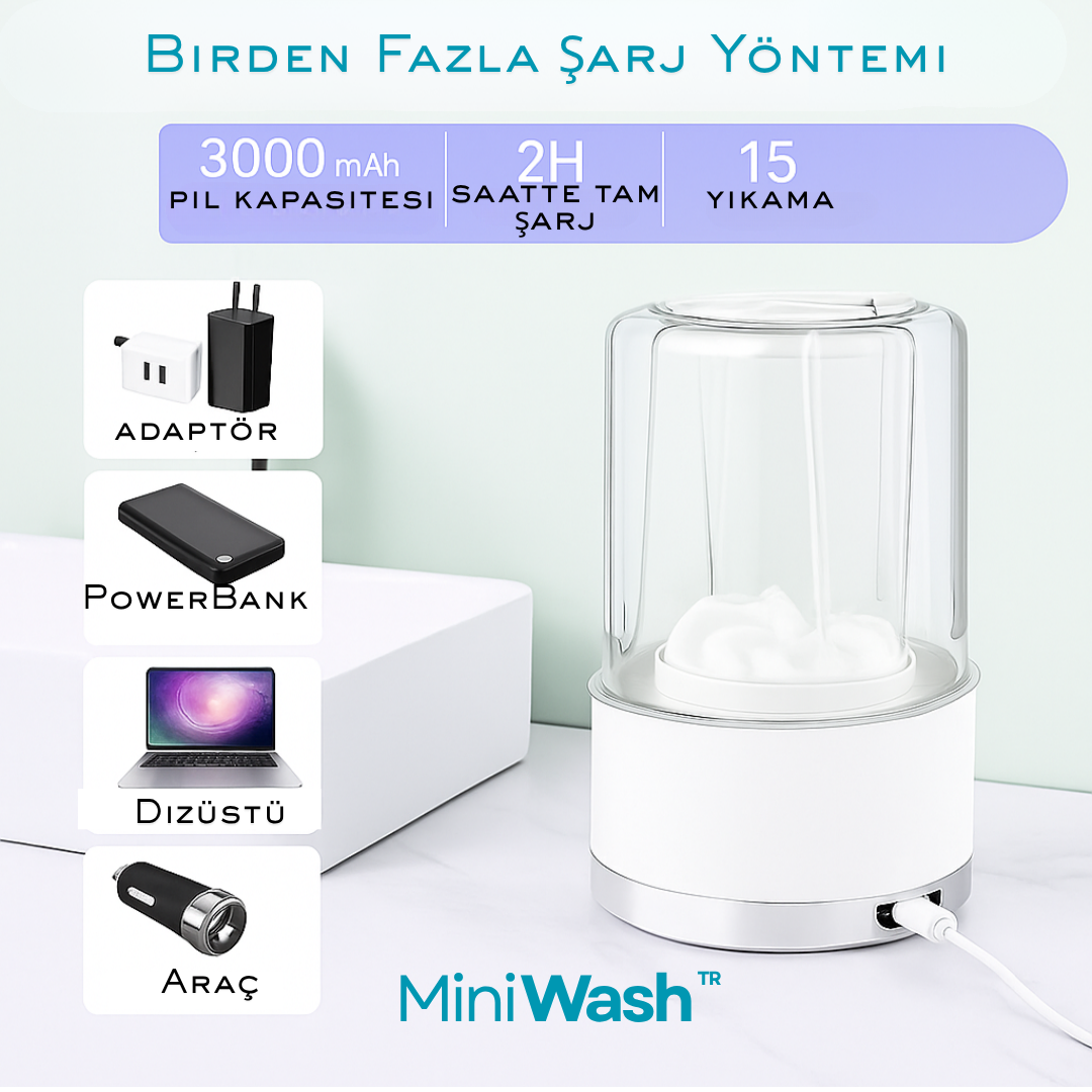 🔋 Hayır, ürün şarjlıdır. Güçlü 3000 mAh pili sayesinde ortalama 12–15 yıkama yapabilir. Elektrik gerektirmez, bu sayede seyahatlerde veya kamp alanlarında da rahatlıkla kullanılabilir.